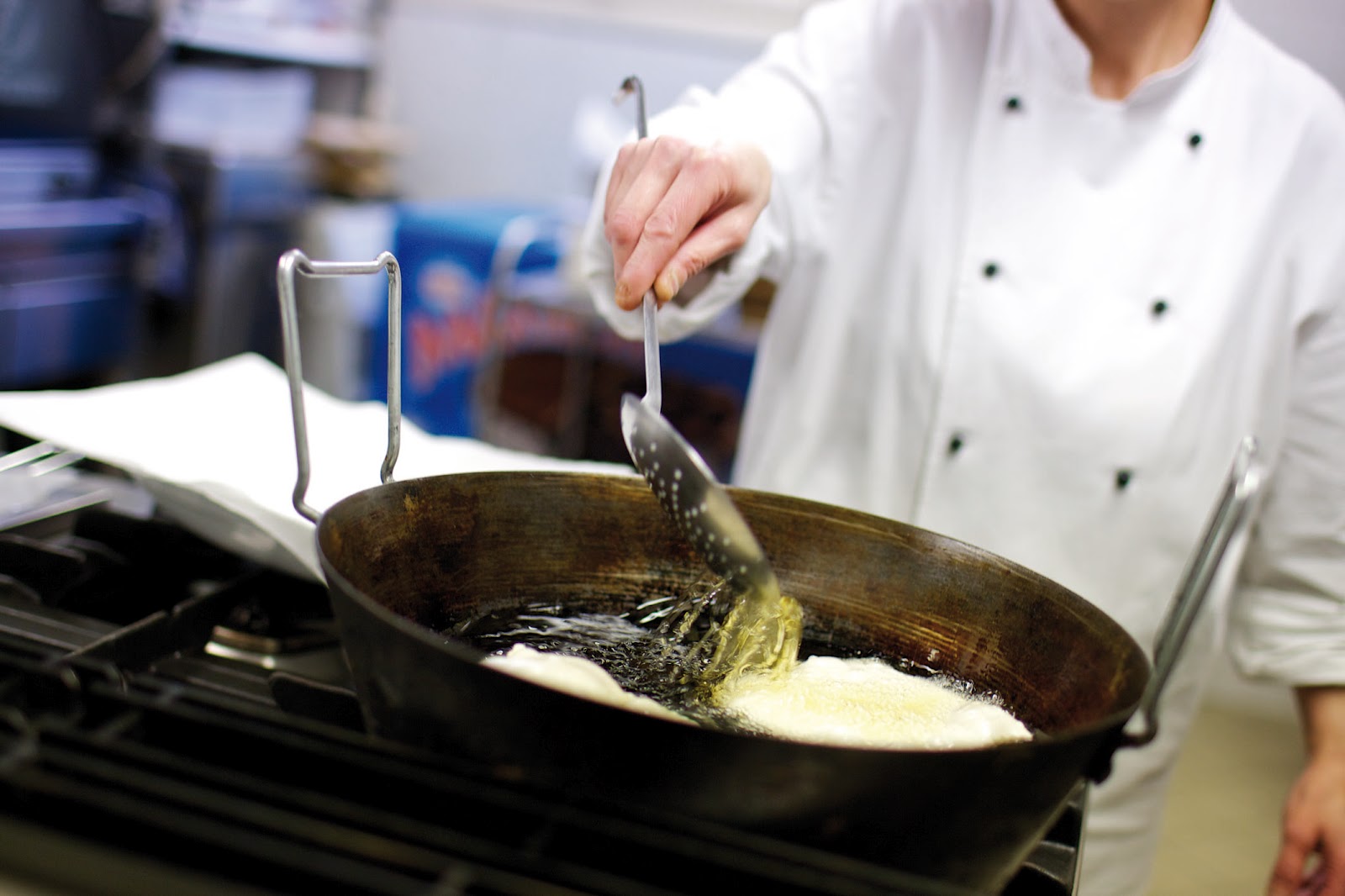 Scalda una padella con metà strutto e metà olio per frittura e scaldalo fino a 180°: la combinazione dei due elementi ti darà una frittura asciutta e senza odori.